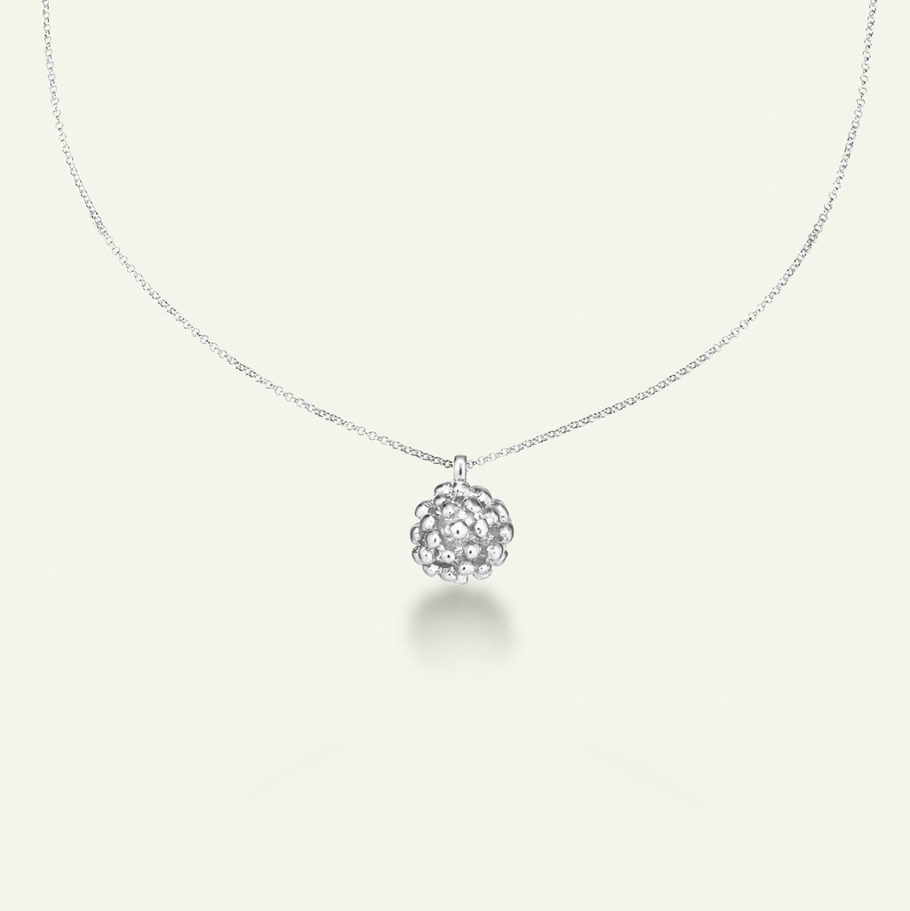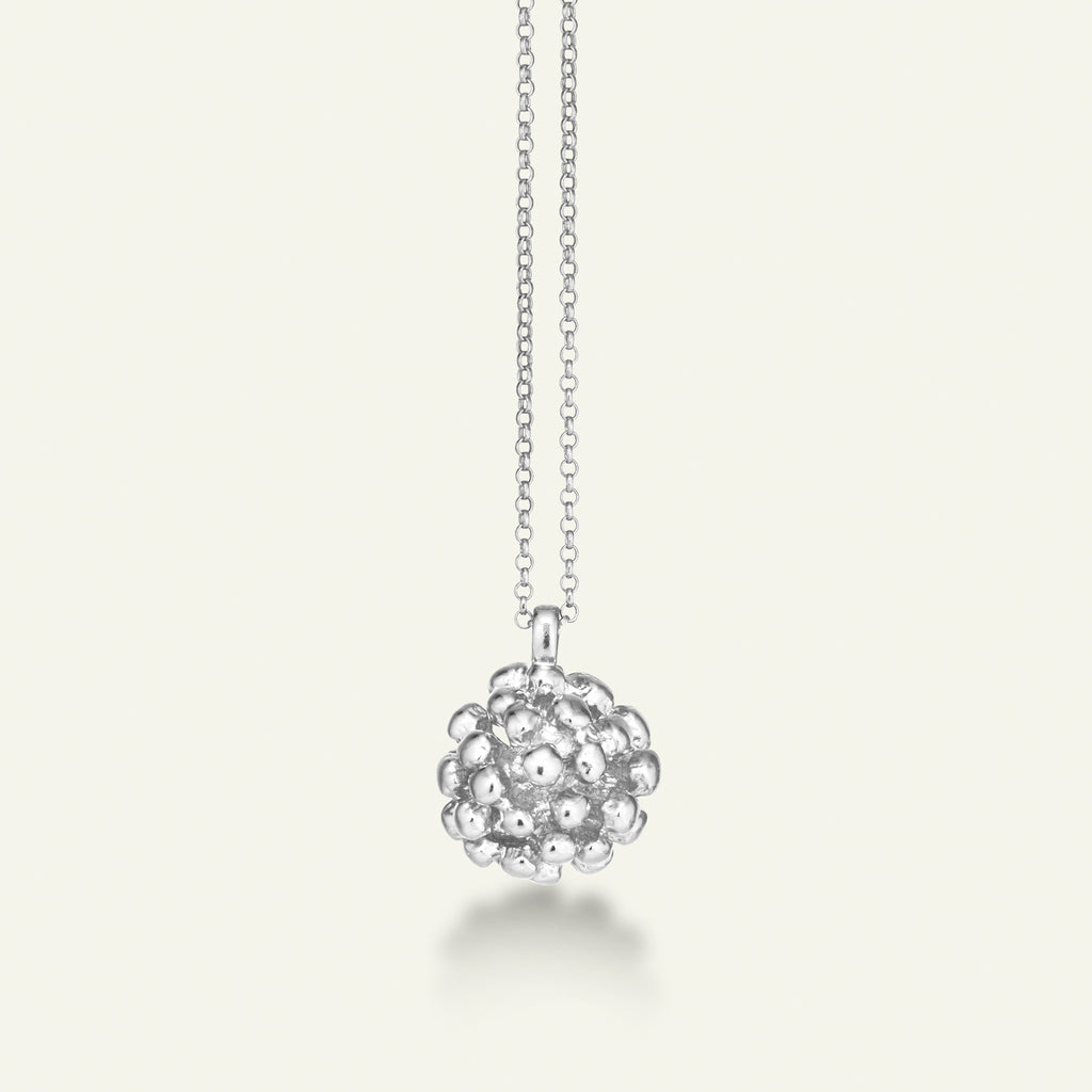 Enkelt, elegant og unikt. Dillblomsten som brukes til anhenget er nøyaktig slik naturen skapte den. Blomstens originale struktur og fine detaljer er godt bevart og gir et unikt og naturlig uttrykk. Anhenget sitter på en elegant kjede som kan justeres i lengden (fra 40 til 45 cm). Anheng og kjede er laget av 100 % resirkulert sterlingsølv med rhodiumbelegg.