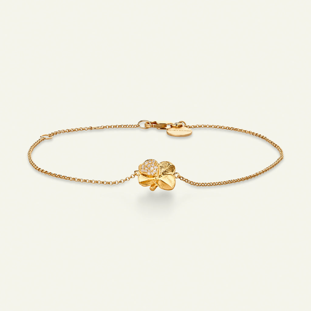 Det populære Firkløver Armbånd fra Flora Danica får et endnu mere eksklusivt udtryk i denne nye version, hvor ét af bladene prydes af 16 håndsatte zirkoner. De funklende sten bringer dybde og lys til designet og gør armbåndet til et markant og elegant statement.