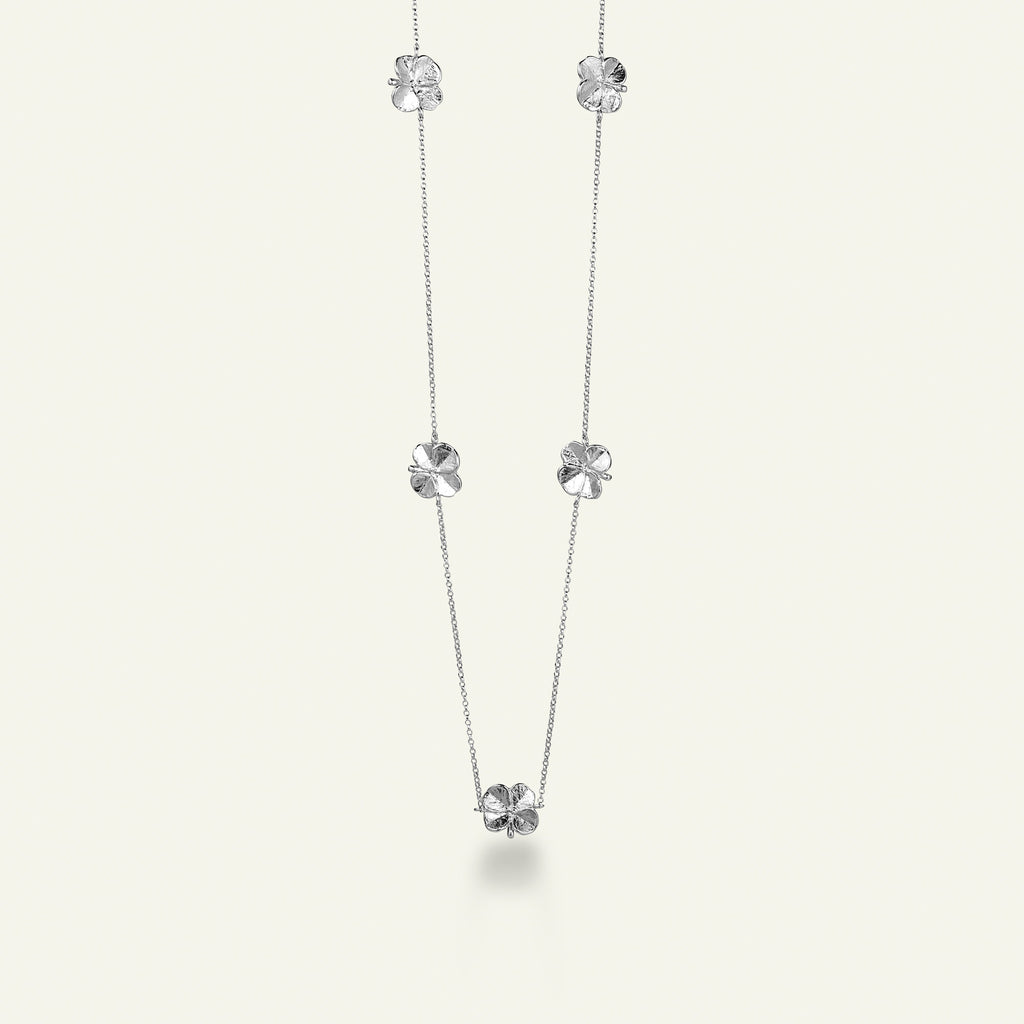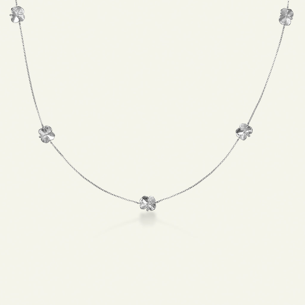 Vedhæng og kæde er udført i det fineste 100% genanvendte sterlingsølv med rhodinering for holdbarhed og den fineste glans. Firkløvernes højde er 8,5 mm og bredden er 9,1 mm. Den justerbare kæde kan let ændres fra en længde på 50 cm og op til enten 55 cm eller 60 cm.