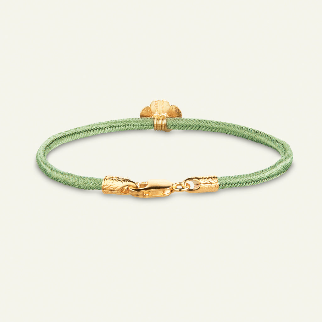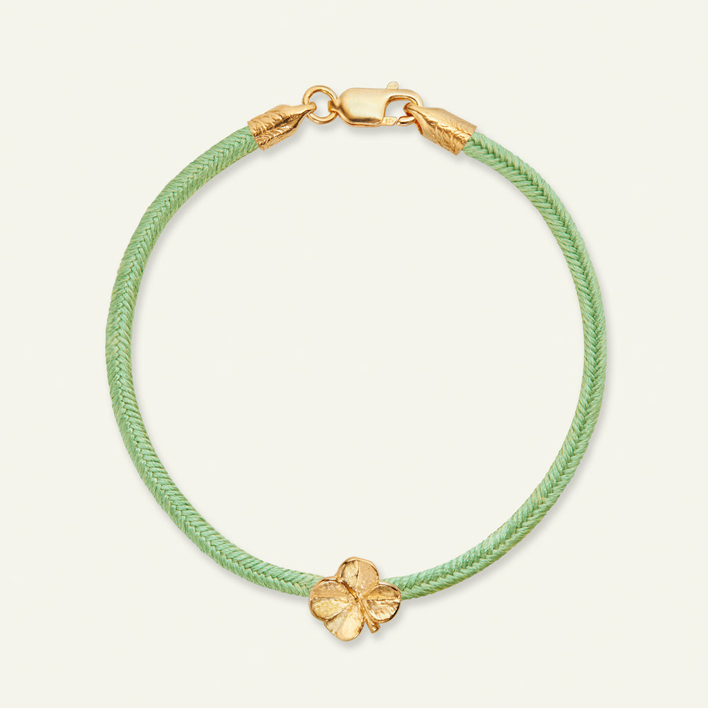 Flora Danicas firkløver kumihimo silkearmbånd er fremstillet af 100% genanvendt sterlingsølv og belagt med 22k guld. Armbåndet er 100% japansk silke og håndlavet i Kyoto.