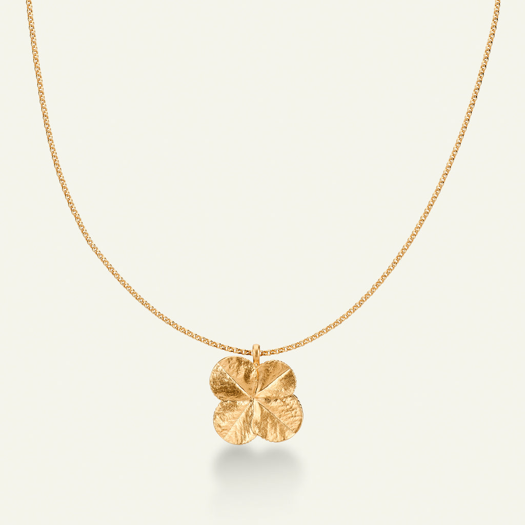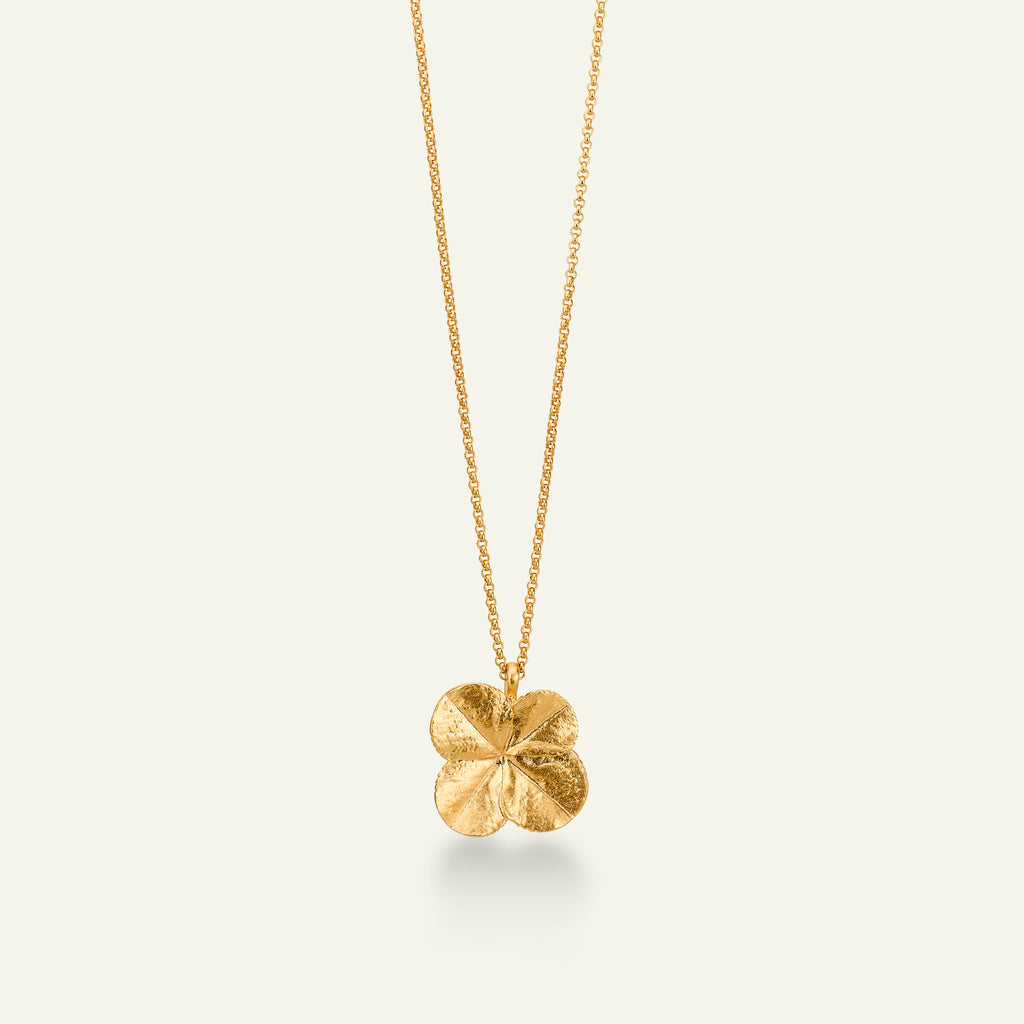Den ægte firkløver, der ligger til grund for dette vedhæng, blev plukket i Danmark i 1952. Designet er naturens eget – de oprindelige strukturer og fine detaljer i firkløveren er nænsomt bevaret og genskabt i stor skala som et markant statement-smykke.
