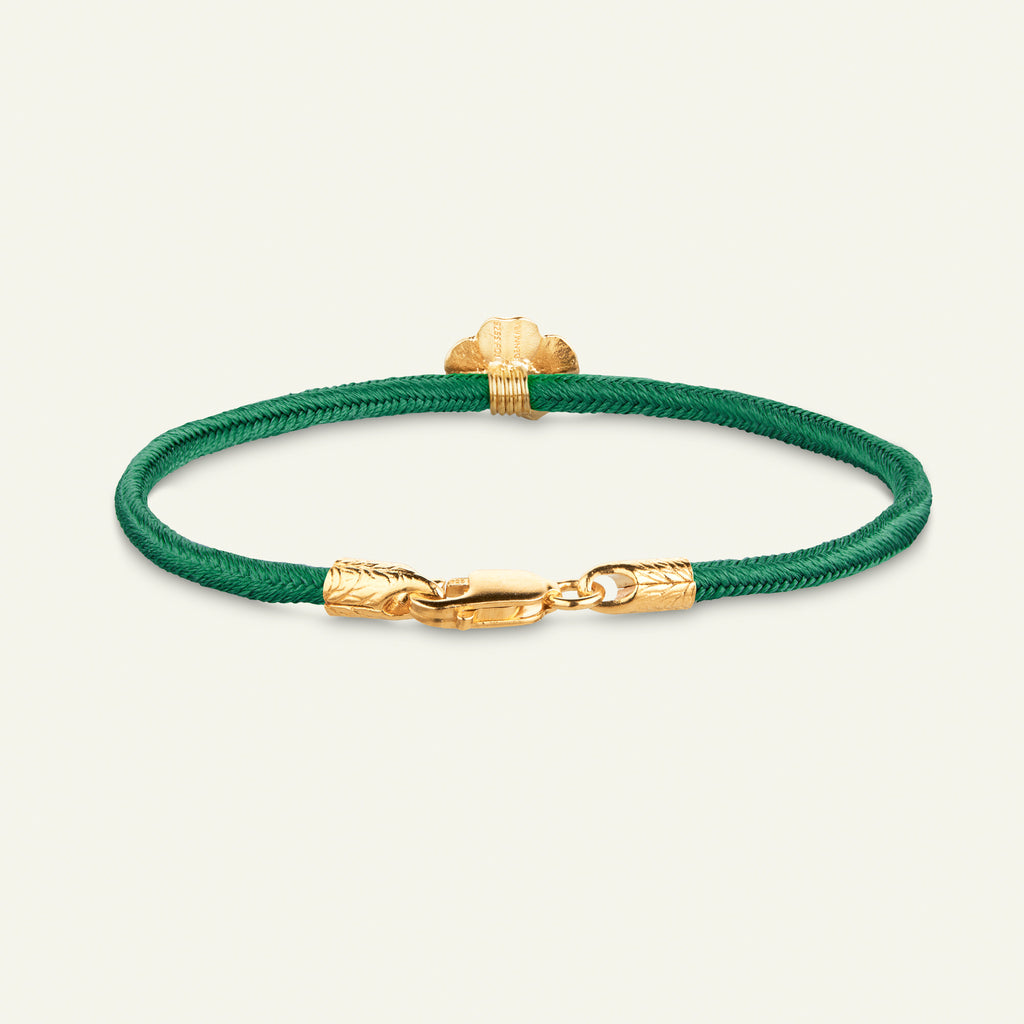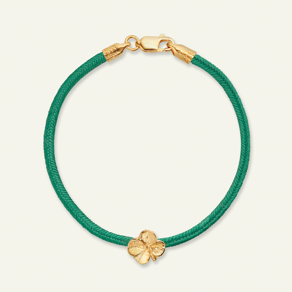 Flora Danicas firkløver kumihimo silkearmbånd er fremstillet af 100% genanvendt sterlingsølv og belagt med 22k guld. Armbåndet er 100% japansk silke og håndlavet i Kyoto.