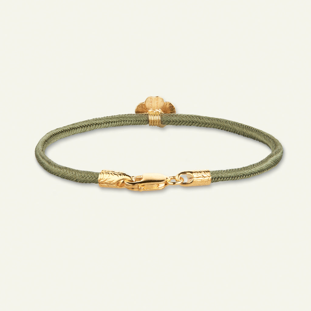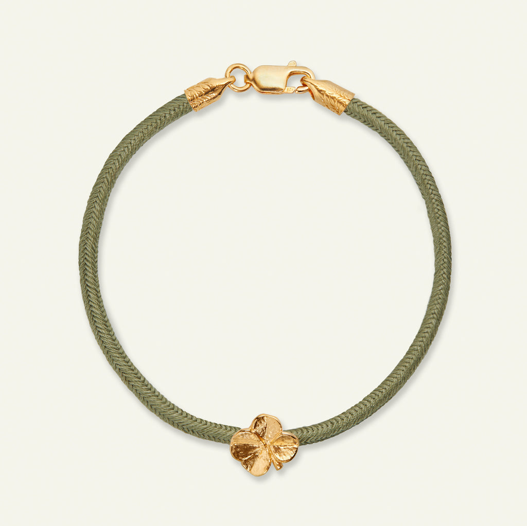 Flora Danicas firkløver kumihimo silkearmbånd er fremstillet af 100% genanvendt sterlingsølv og belagt med 22k guld. Armbåndet er 100% japansk silke og håndlavet i Kyoto.