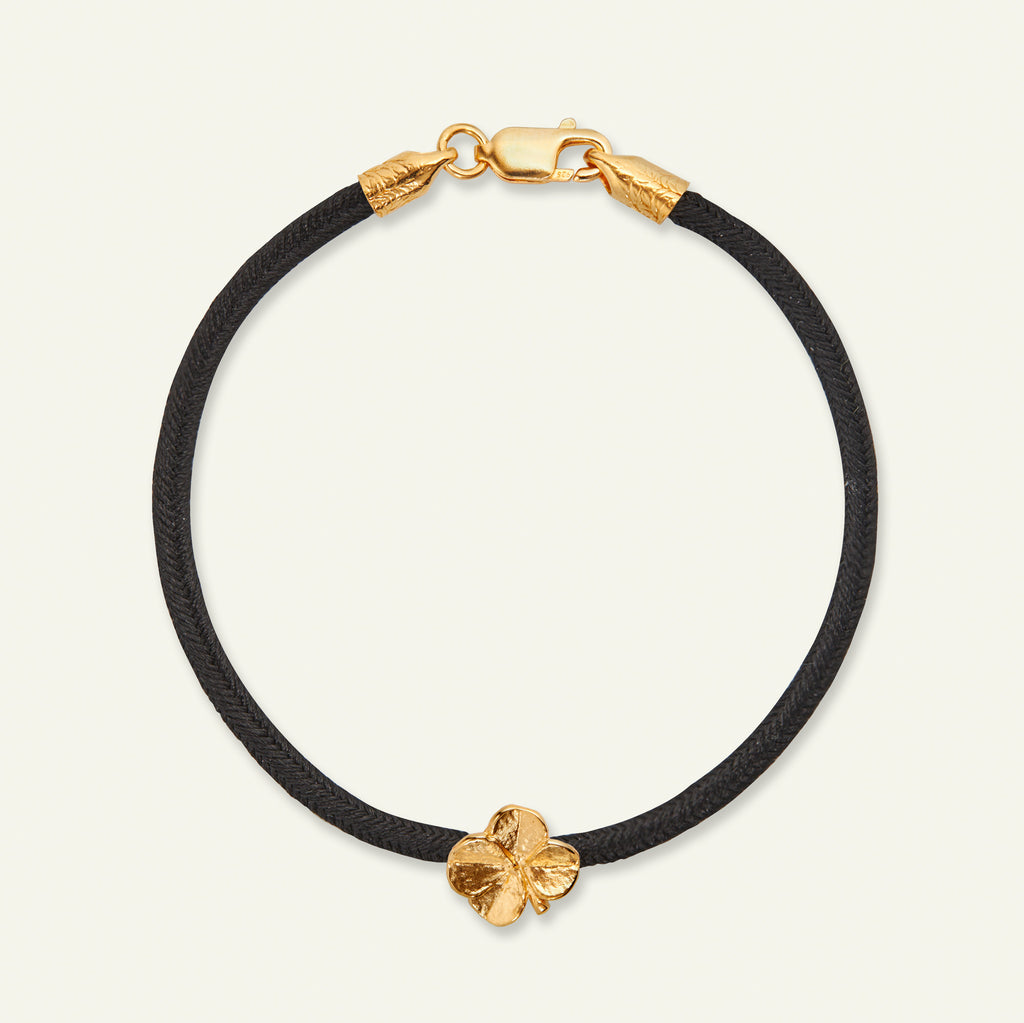 Flora Danicas firkløver kumihimo silkearmbånd er fremstillet af 100% genanvendt sterlingsølv og belagt med 22k guld. Armbåndet er 100% japansk silke og håndlavet i Kyoto.