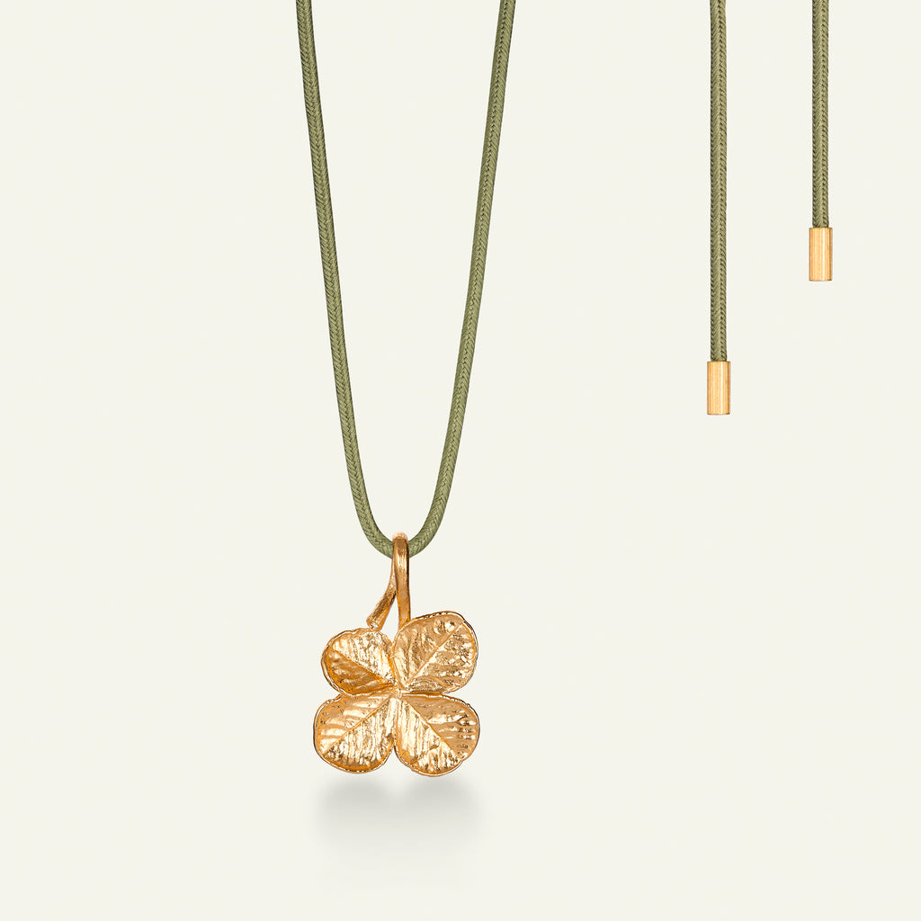 Firkløveren måler 3,8 x 2,8 cm og er håndlavet i høj kvalitet og skabt med den største respekt for miljø og bæredygtighed i både produktion og materialer. Den er fremstillet af 100% genanvendt sterlingsølv og belagt med 22k bæredygtigt genanvendt guld. Snoren måler 120 cm og er håndlavet i Kyoto, Japan, af 100% japansk silke.