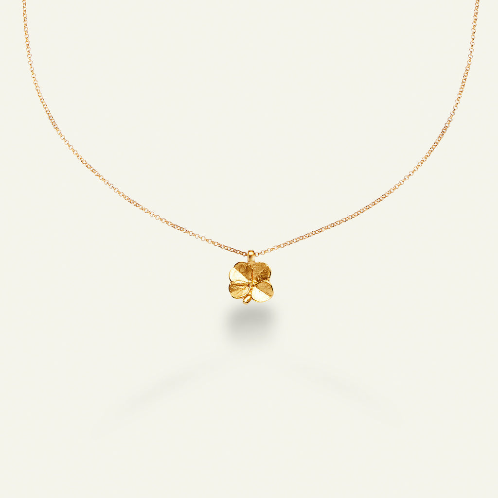 Vedhæng og kæde er udført i det fineste 100% genanvendte sterlingsølv med en bæredygtig 22 karat forgyldning. Firkløverens højde (mm) 11,0. Bredde (mm) 9,2.