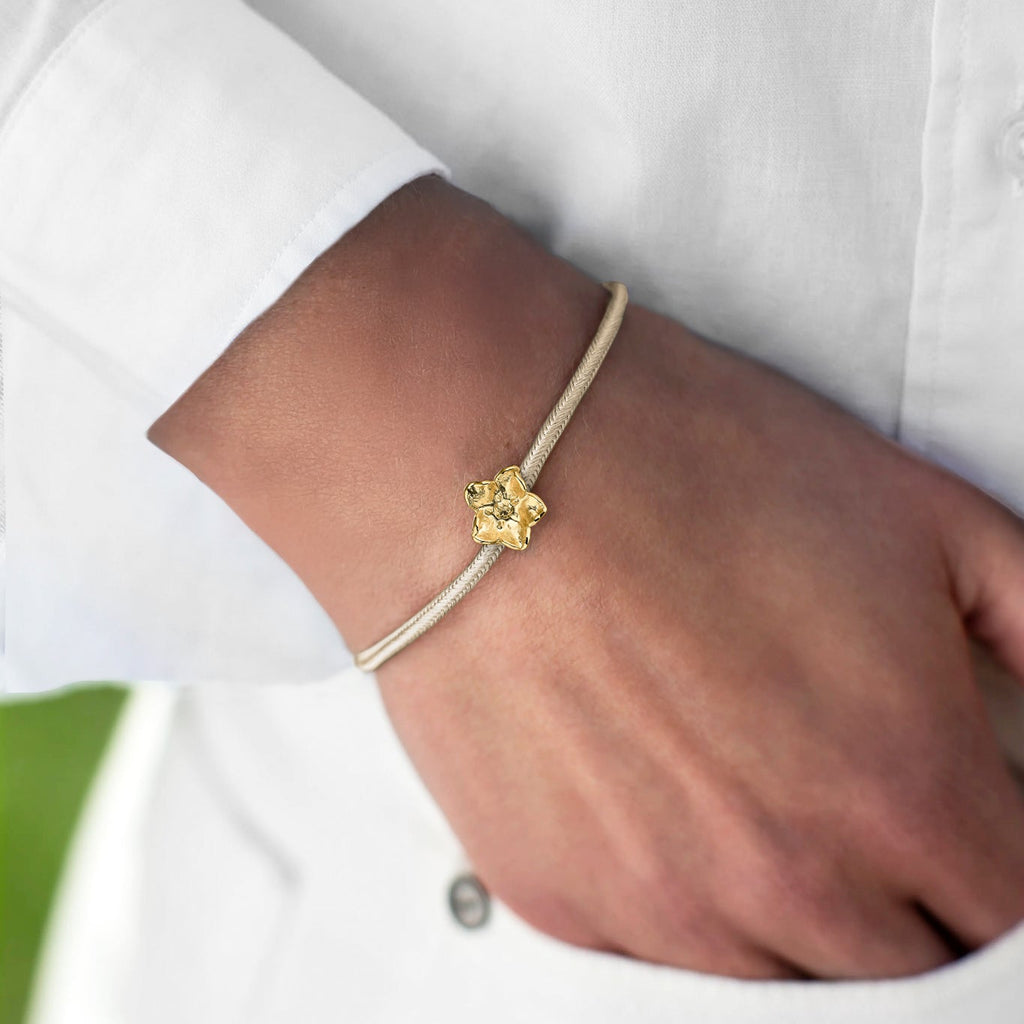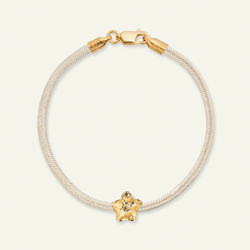 Flora Danicas forglemmigej kumihimo silkearmbånd er fremstillet af 100% genanvendt sterlingsølv og belagt med 22k guld. Armbåndet er 100% japansk silke og håndlavet i Kyoto.